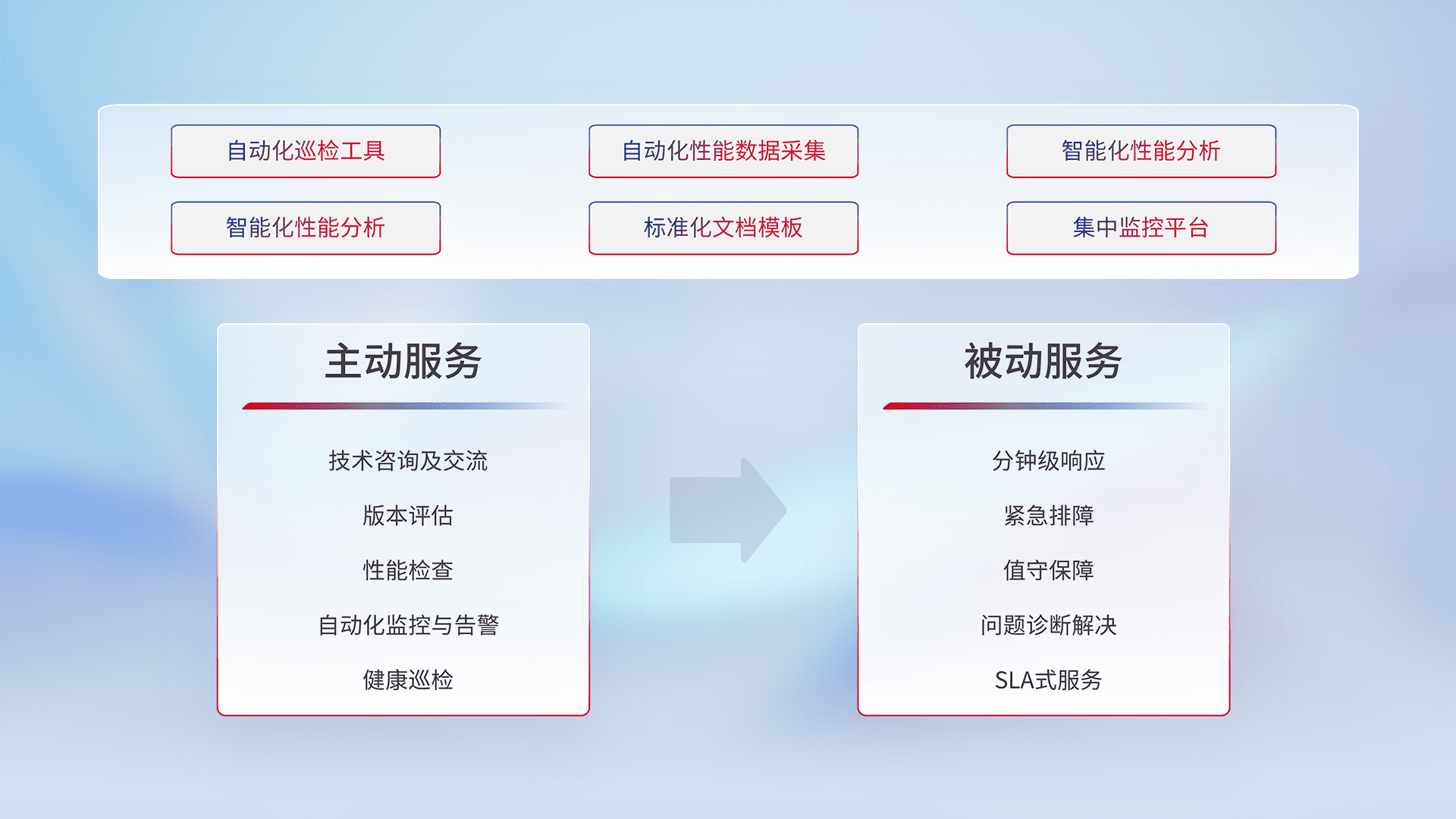 智能化工具和标准化文档,,,,保障服务质量,,,提供主动服务(包含技术咨询、、版本评估、、、性能检查、、自动化监控与告警、、健康巡检)和被动服务包含(分钟级响应、、紧急排障、、值守保障、、、、问题诊断解决、、、、SLA服务)。。。。