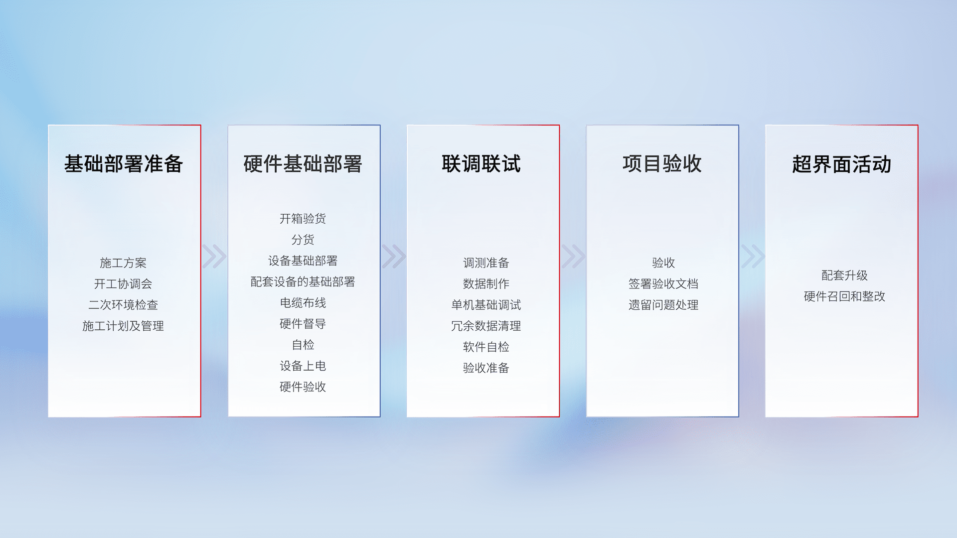 从基础部署准备、、硬件基础部署、、、、联调联试、、、项目验收、、越界面活动的全过程可追溯,,保证施工质量和进度。。。